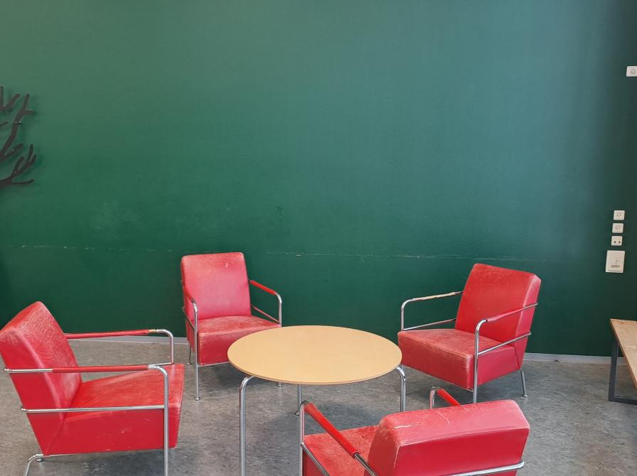 Studierummet er et lille rum med plads til 4 personer. Døren er 80 cm bred. Studierummet skal bookes via dette link.